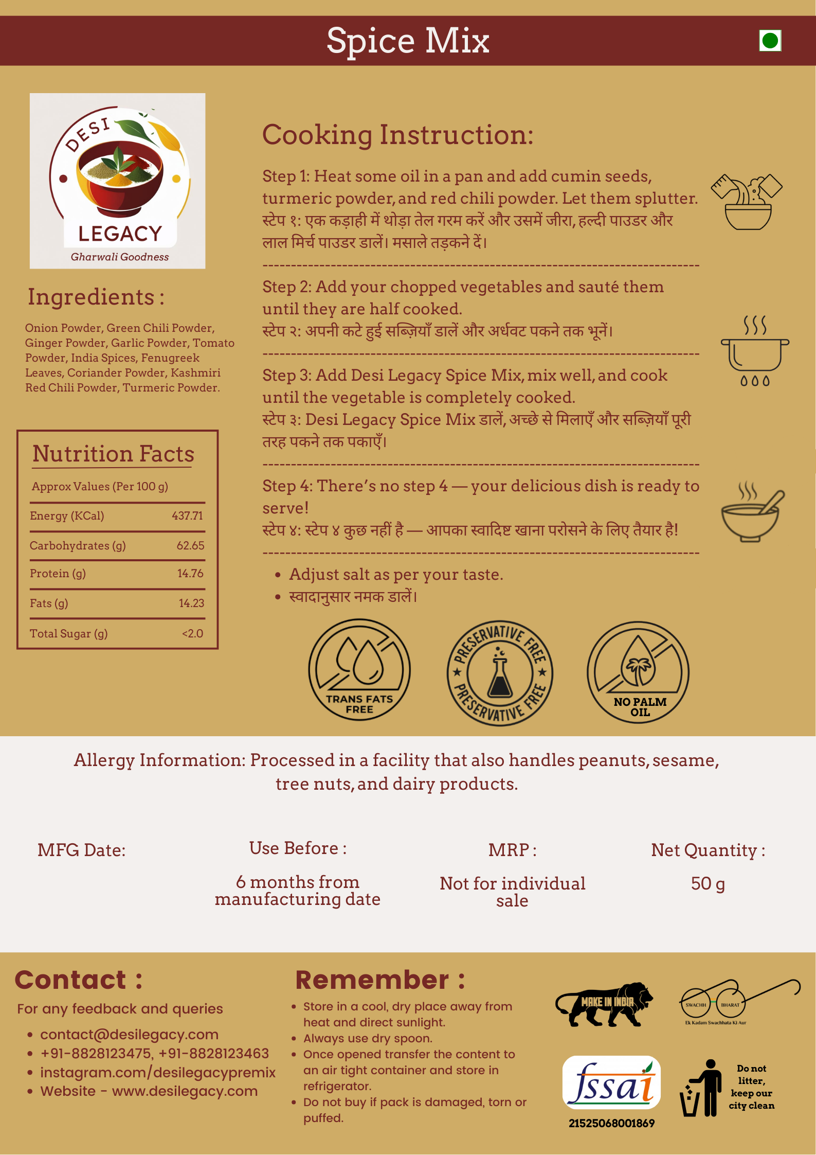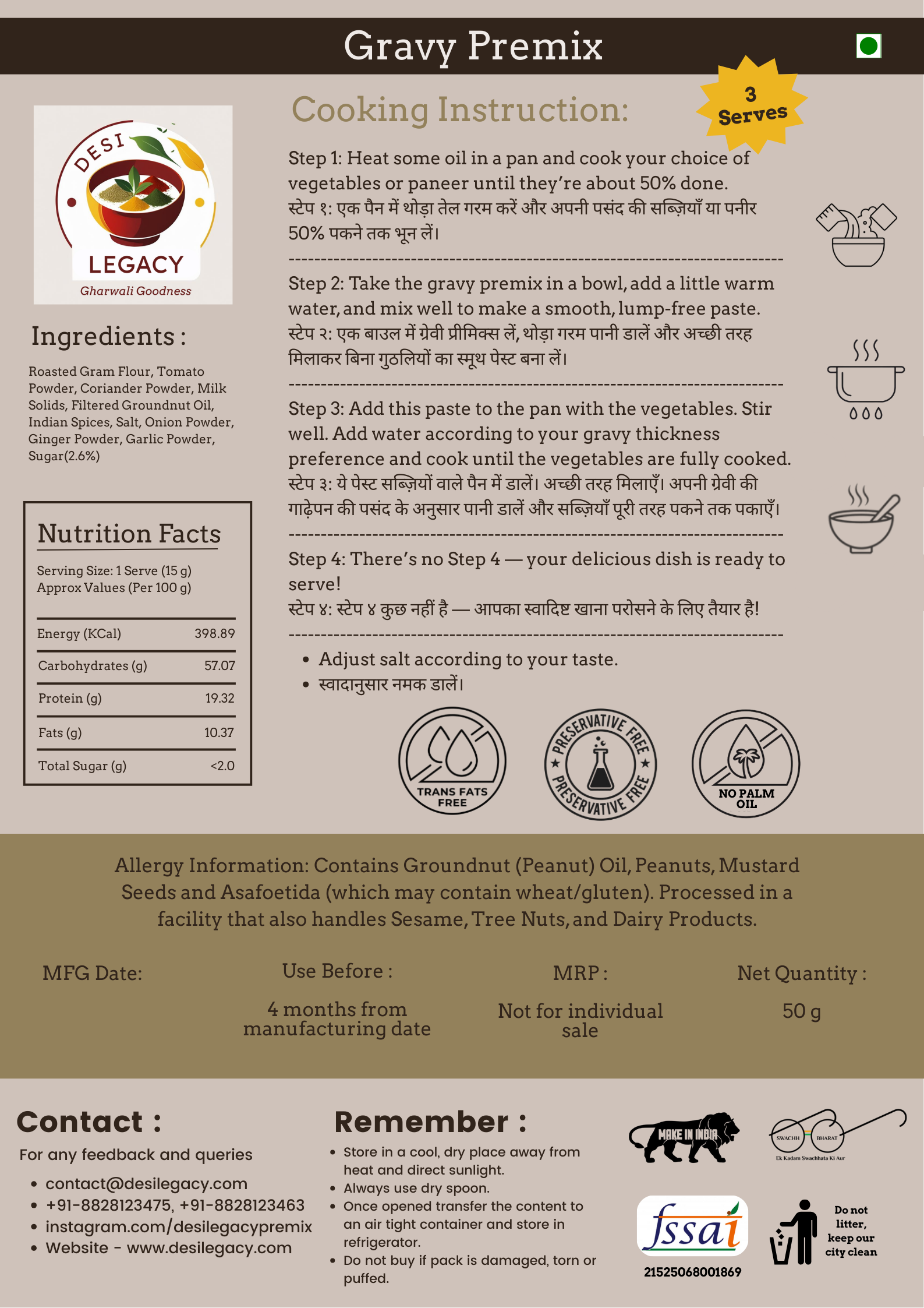 Bring home the perfect blend of flavor and convenience with our Desi Legacy Gravy Premix & Spice Mix Combo! This specially curated pack includes a variety of our signature gravy premixes and spice mixes, making everyday cooking effortless and packed with authentic desi flavors. Whether it’s a rich, homestyle curry or a perfectly spiced sabzi, this combo ensures your meals taste just like they’re made in your mother’s kitchen — with no preservatives, no artificial colors, and all-natural ingredients.