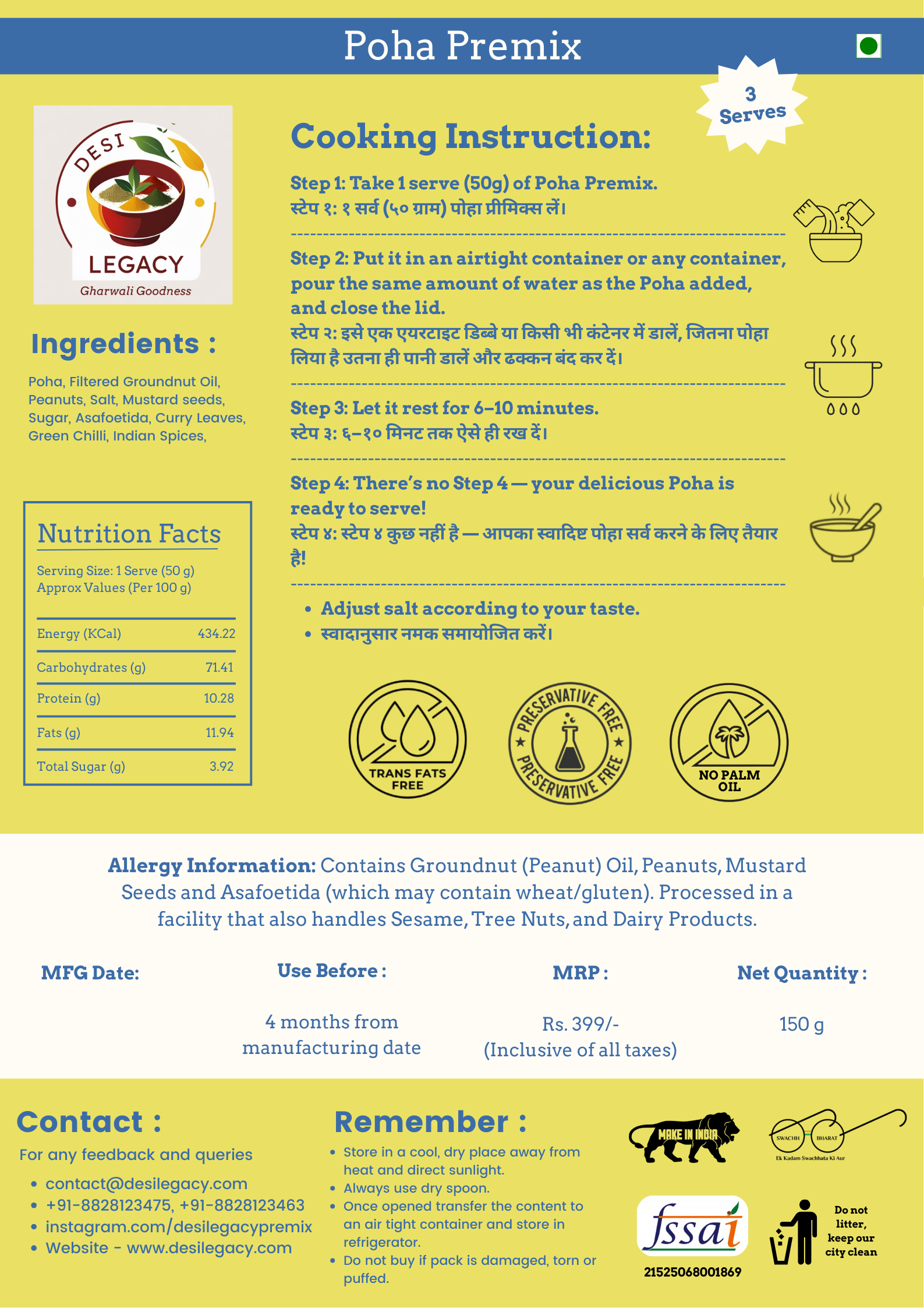 Enjoy a light, nutritious Indian breakfast in minutes with our Poha Premix. Featuring flattened rice, peanuts, curry leaves, and spices, it’s perfect for travel, busy mornings, or healthy snacking—just add hot water or steam and eat.
